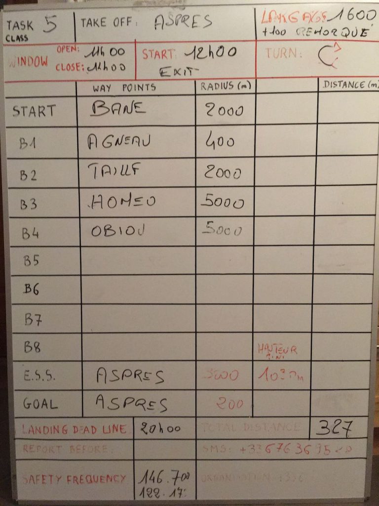 Premier point de virage aux Agneaux, puis le Taillefer pour maintenir les pilotes à l’écart du Champsaur, où la veille s’était développé un gros cumulonimbus non prévu par les modèles, puis Sederon, retour au Pic de l’Obiou avec un rayon de 5km en prévision d’un éventuel Cb sur le Dévoluy, et goal à Aspres: 310km