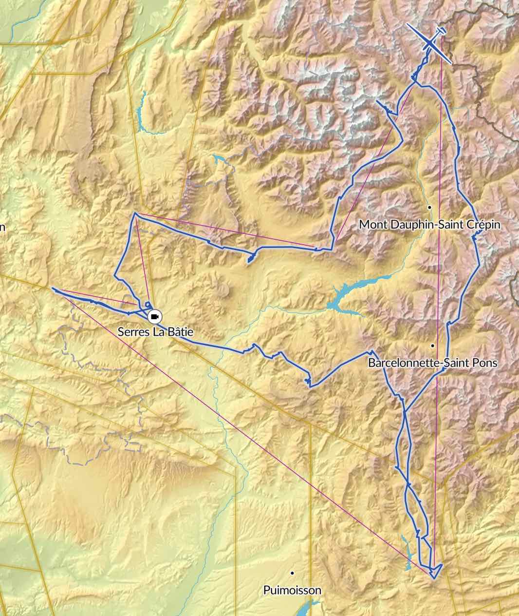 jac, décollé un peu plus tôt de Serres tourne un 450km selon OLC planeurs, mais un triangle FAI de seulement 371km car contrairement à Philippe, il n’a pas osé aller tourner son dernier point de virage vers le sud sud-est de Saint André dont toute la zone était dans le bleu…