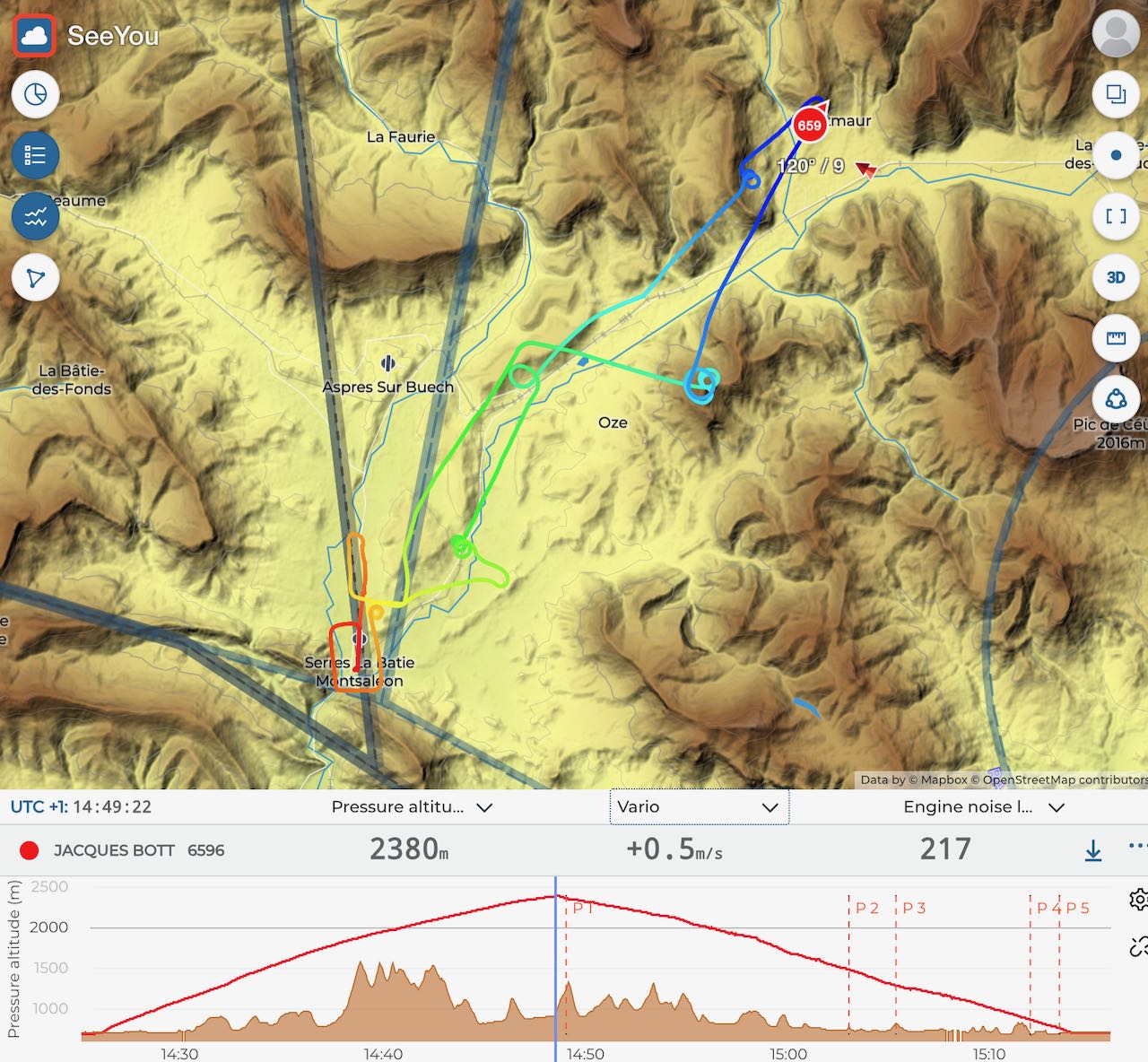 Décollage 12:35 avec 20km/h de travers gauche au sol, à 50m/sol déclenchement des hostilités, très fortes rafales, cisaillements et rotors, « accroche-toi jac », la main gauche agrippée au gros tube de structure je vire vers Arambre, où il n’était ni nécessaire ni recommandé de serrer la pente…