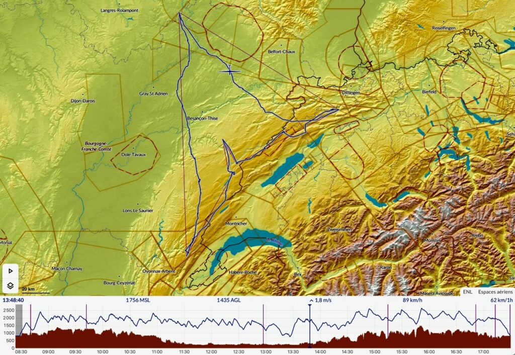 Le 17.05 au matin, je décolle à 10h28 de l’aérodrome de Pontarlier, à 840 m d’altitude. Moteurcoupé à 10h32, à 1350 m, soit une montée de 500 m en 4 minutes.